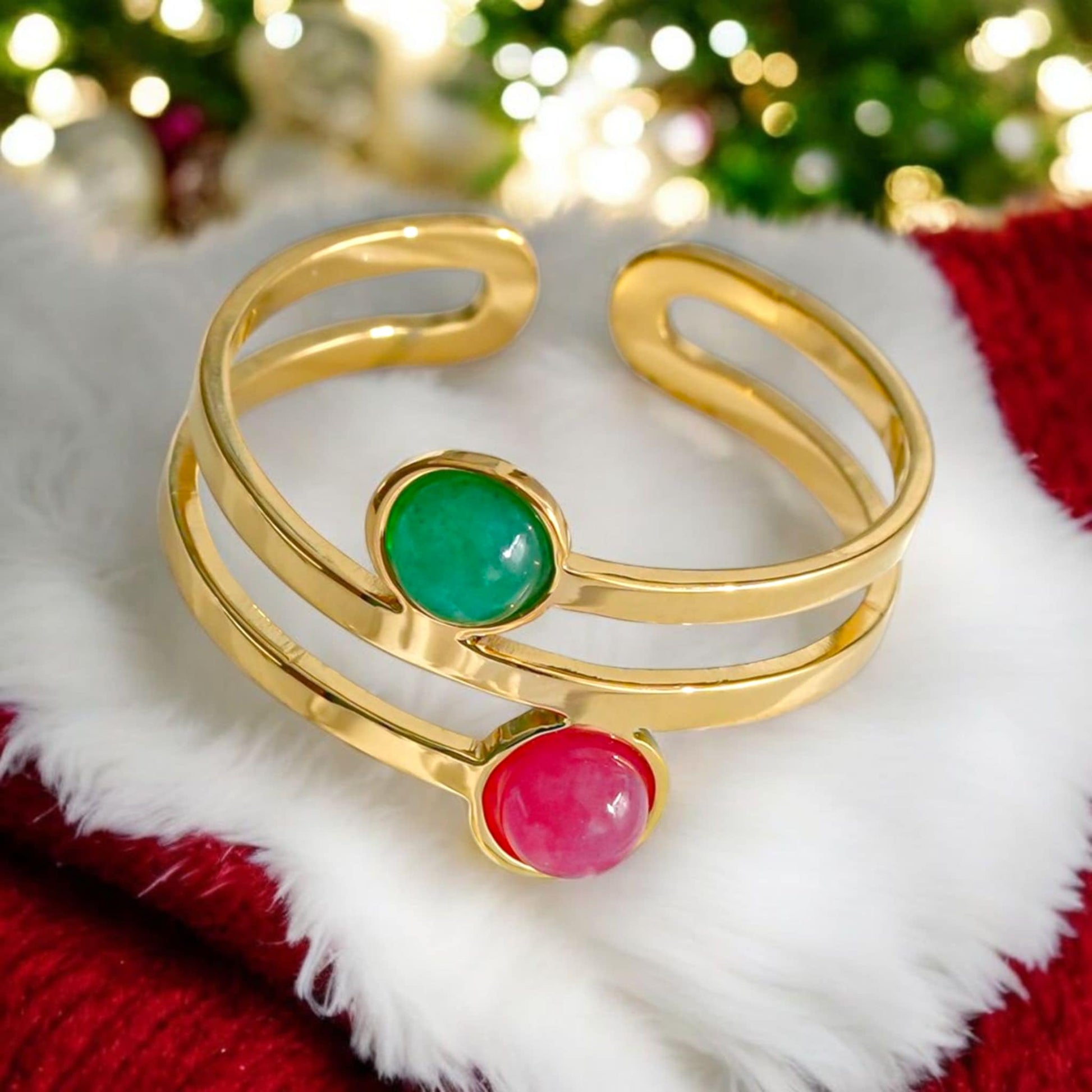 Cette bague dorée réglable, ornée de pierres rouge et verte, allie élégance et durabilité. Conçue en acier inoxydable, elle résiste à l'eau et au temps, vous accompagnant au quotidien sans perdre son éclat. Un choix parfait pour sublimer votre style avec confiance.